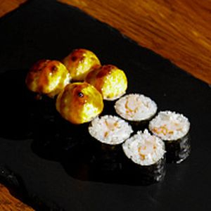 Заказать Креветка, рис, сырная шапка, соус терияки, водоросли нори.