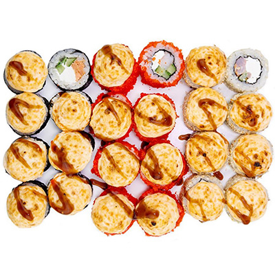 1. Бонито унаги 2. Эби икура 3. Классика лососем и сыром 4. Запеченная классика с крабом 5. Запеченная классика с мидиями 6. Запеченная классика с огурцом и лососем