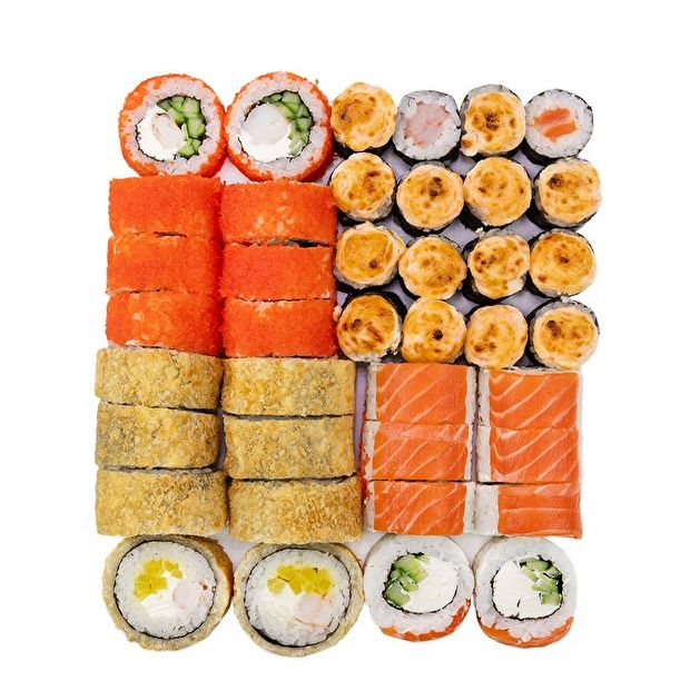 1. Темпура Классика с лососем 2. Бостон запеченныйг. 3. Сливочный лосось запеченный 4. Филадельфия лайт 5. Эби икура 6. Темпура Классика с королевской креветкой