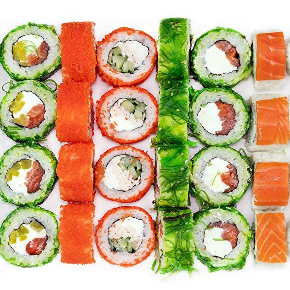 Заказать 1. Калифорния 240г (Снежный краб(имитация), огурец, сливочный сыр, икра масаго, нори) 2. Вакаме 240г (Лосось, маринованный дайкон, сыр сливочный, чука, кунжутный соус, нори, рис) 3. Филадельфия лайт 230г (Лосось, огурец, сливочный сыр, нори) 4. Салмон чука 260г (Лосось, сыр сливочный, чука, кунжутный соус, нори, рис)