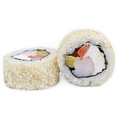 Заказать Рис, королевские креветки, сыр сливочный, маринованный дайкон, перец, нори, кунжут белый. Не забудьте японский гарнир!