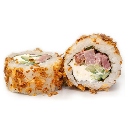 Сливочный сыр, ветчина, томат, огурец, лук криспи, нори. Не забудьте японский гарнир!