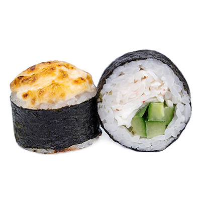 Рис, краб, огурец, сырный соус, унаги соус. Не забудьте японский гарнир!