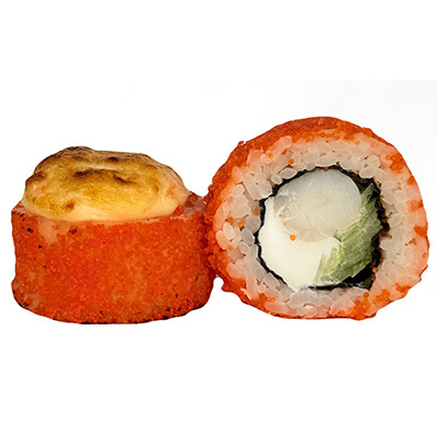 Рис, королевская креветка, огурец, сливочный сыр, икра масаго, сырный соус, соус унаги, нори. Не забудьте японский гарнир!