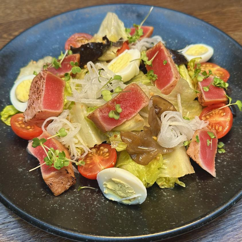 Тунец, салат романо, томат черри, редис, гриб Муэр, горчичная заправка, перепелиное яйцо.