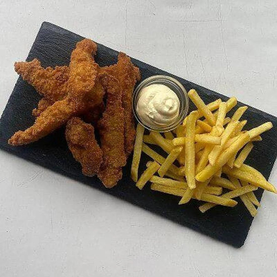 Окунь в кляре, картофель фри, фирменный соус.
