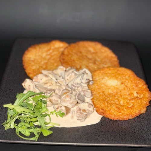 Заказать Драники, курица, грибы, лук, сливки, соль, перец.