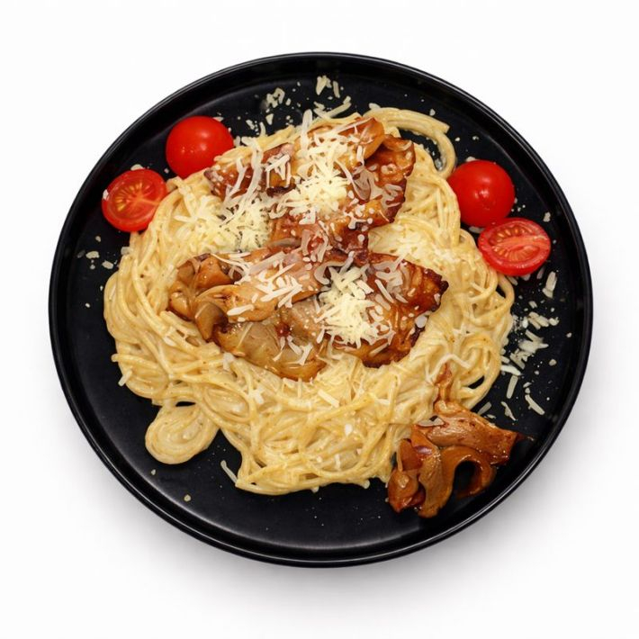 Спагетти, курица, грибы, сливки, пармезан.