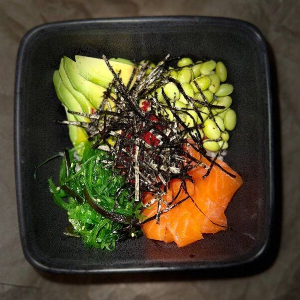 Рис, соус Терияки, тунец, авокадо, огурец, эдамаме, соус Спайси, нори, кунжут черный, имбирь.