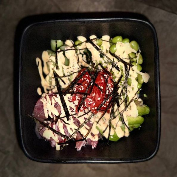 Рис, соус Терияки, тунец, авокадо, огурец, эдамаме, соус Спайси, нори, кунжут черный, имбирь.