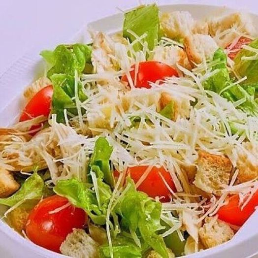 Айсберг, креветки, черри, яйца перепелиные, пармезан, гренки, соус Цезарь.