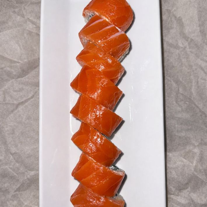 Рис, нори, сыр, авокадо, огурец, лосось, соус Унаги, нити Чили.