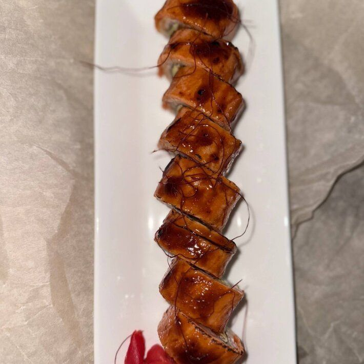 Рис, нори, сыр, авокадо, огурец, лосось, соус Унаги, нити Чили.