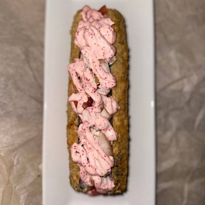 Рис, нори, сыр, такуан, помидор, курица, цезарь, розовый соус.