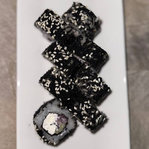 Рис, сыр, нори, тунец, огурец, масаго черная, кунжут.