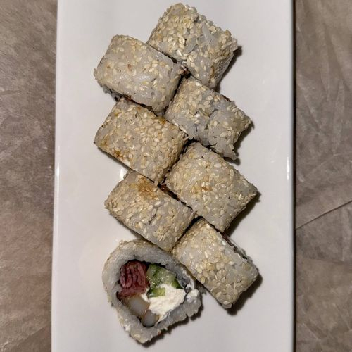 Рис, сыр, нори, креветка темпура, огурец, тунец, авокадо, снежный краб, соус унаги, соус спайси, лук фри, кунжут.