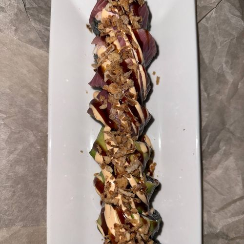 Рис, сыр, нори, креветка темпура, огурец, тунец, авокадо, снежный краб, соус унаги, соус спайси, лук фри, кунжут.