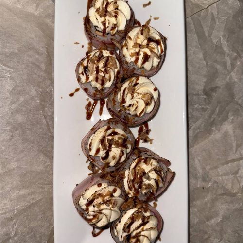 Рис, сыр, нори, бекон, огурец, снежный краб, соус табаско, соус унаги, лук фри.