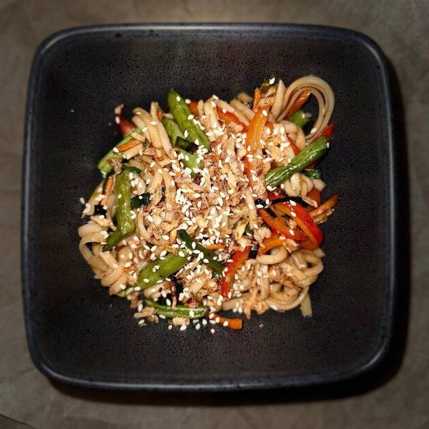 Удон, перец, морковь, спаржевая фасоль, лук-порей, соус Терияки.