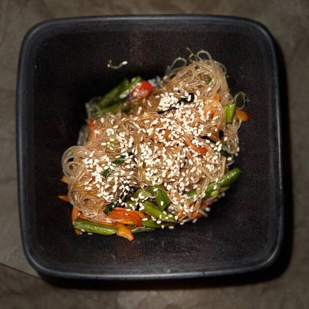 Фунчоза, перец, морковь, спаржевая фасоль, лук-порей, соус Терияки.