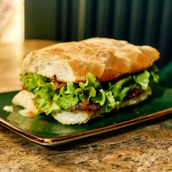 Сэндвич с говядиной и сыром, пряными огурчиками и фирменной заправкой.