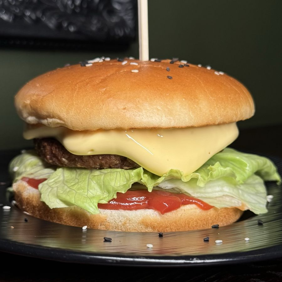 Булка, котлета, кетчуп, огурец маринованный, лук маринованный, помидор, салат айсберг, сырный соус.