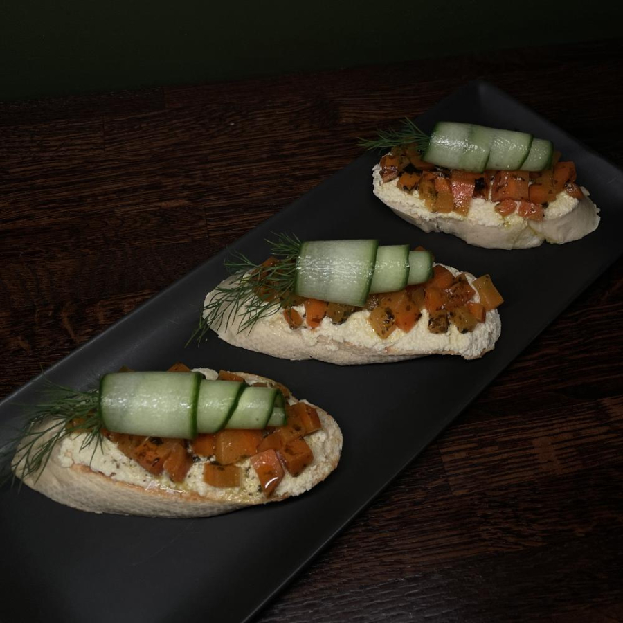 Французский багет, маринованная морковь, твороженный сыр, огурец.