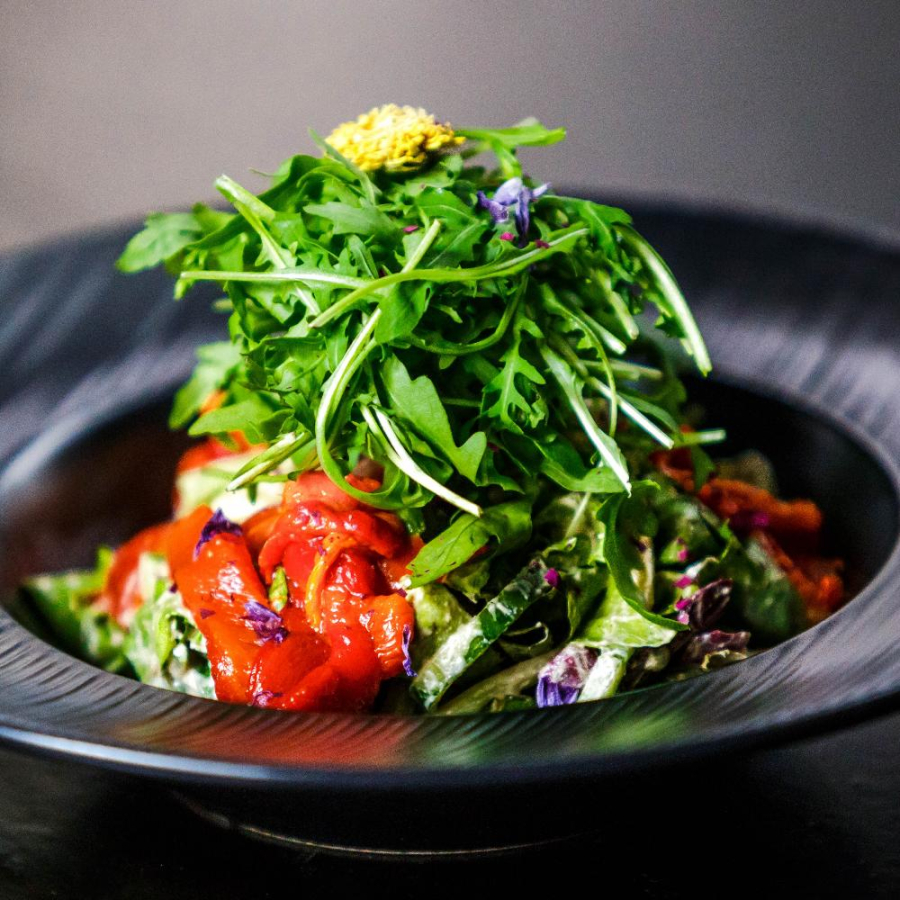 Салат Айсберг, соус Гуакамоле, соевый бефстроганов с ароматом копчения, запеченный болгарский перец, помидоры Черри, оливки, руккола, бальзамический крем.