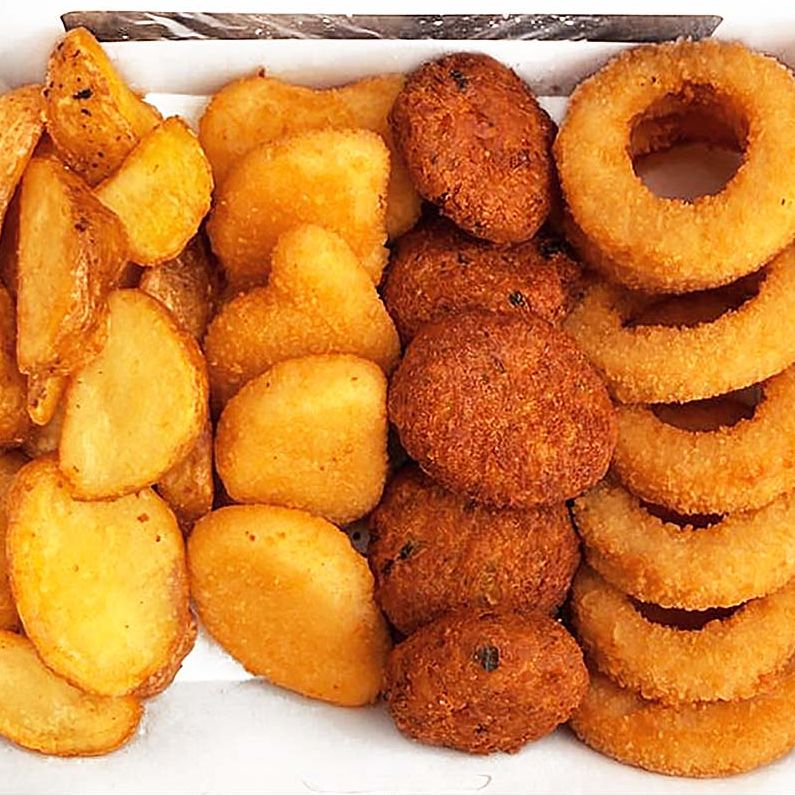 Заказать Луковые кольца, наггетсы, фалафель, картофель по-деревенски, кетчуп, фирменный соус.