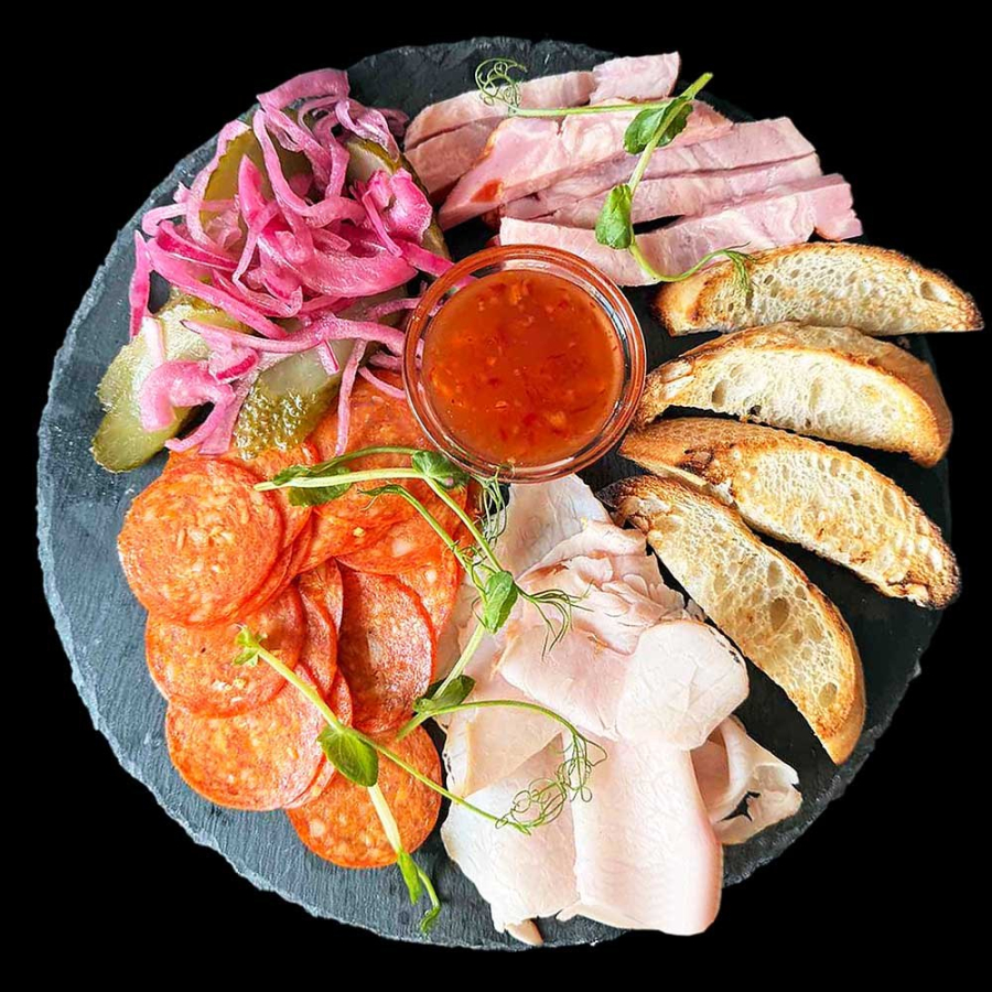 Кумпячок к/в, грудинка к/в, колбаса с/к, корнишоны, лук маринованный, чиабатта, соус чили сладкий.