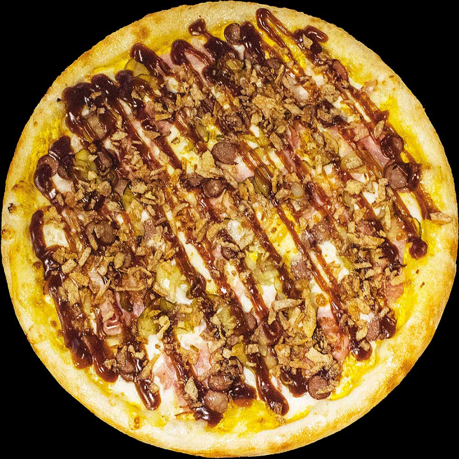 Заказать Сыр моцарелла, грудинка к/в, колбаски, корнишоны, соус горчичный, соус барбекю, лук жареный, ароматное масло.
