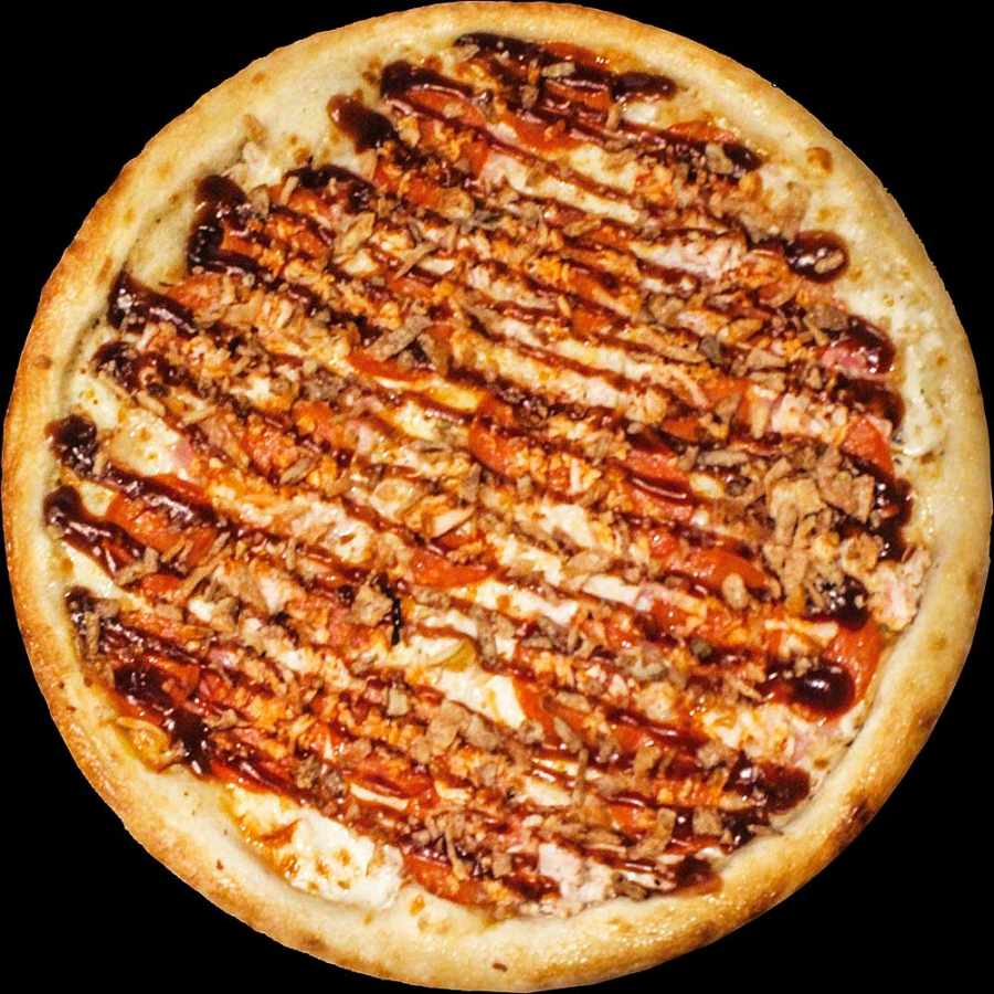 Сыр моцарелла, грудка куриная, грудинка к/в, колбаса с/к, соус барбекю, соус Альфредо, лук жареный, ароматное масло.