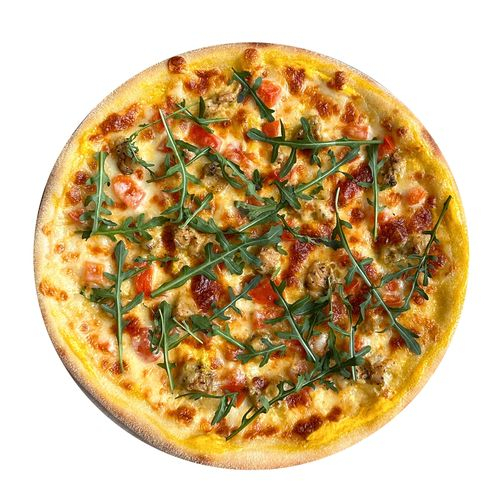 Сырный соус, курица, томаты, руккола, сыр моцарелла.