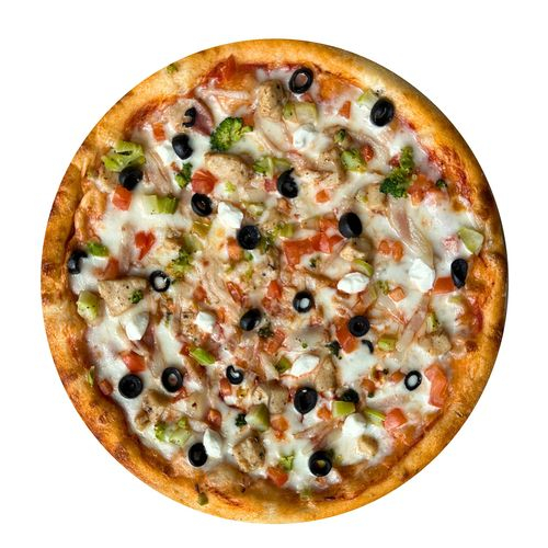 Томатный соус, курица, бекон, томаты, брокколи, маслины, сыр сливочный, сыр моцарелла.