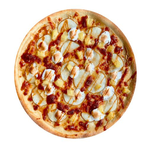 Сливочный соус, груша, ананас, маршмеллоу, топпинг карамельный, сыр моцарелла.