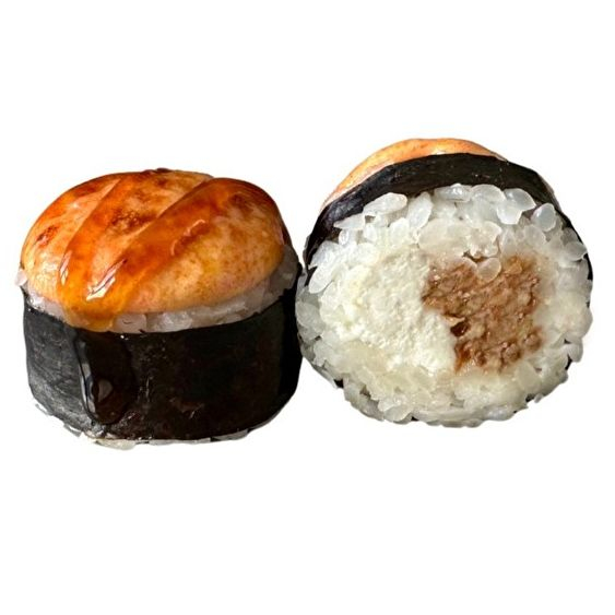 Лосось терияки, сыр сливочный, сырная шапка спайси, соус Унаги, кунжут, рис, нори.