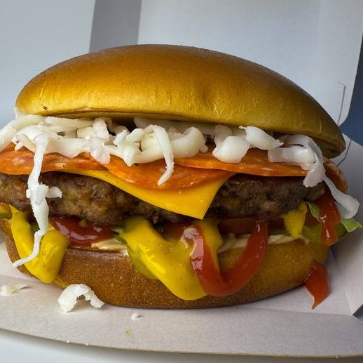 Заказать Котлета свинина-говядина, кетчуп, пепперони, баварская горчица, моцарелла, соус 1000 островов, помидор, огурец.