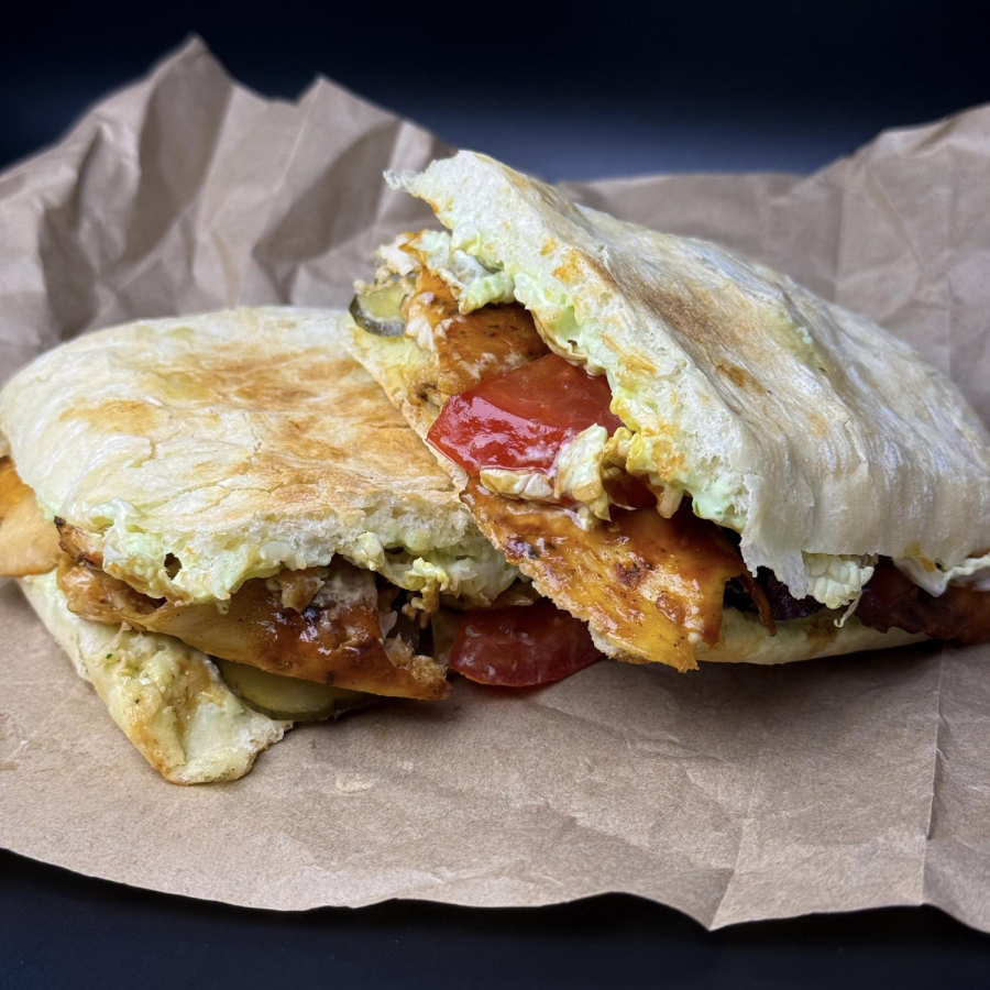 Панини, курица, чесночный соус, пекинка, помидор, маринованные огурцы, соус барбекю.