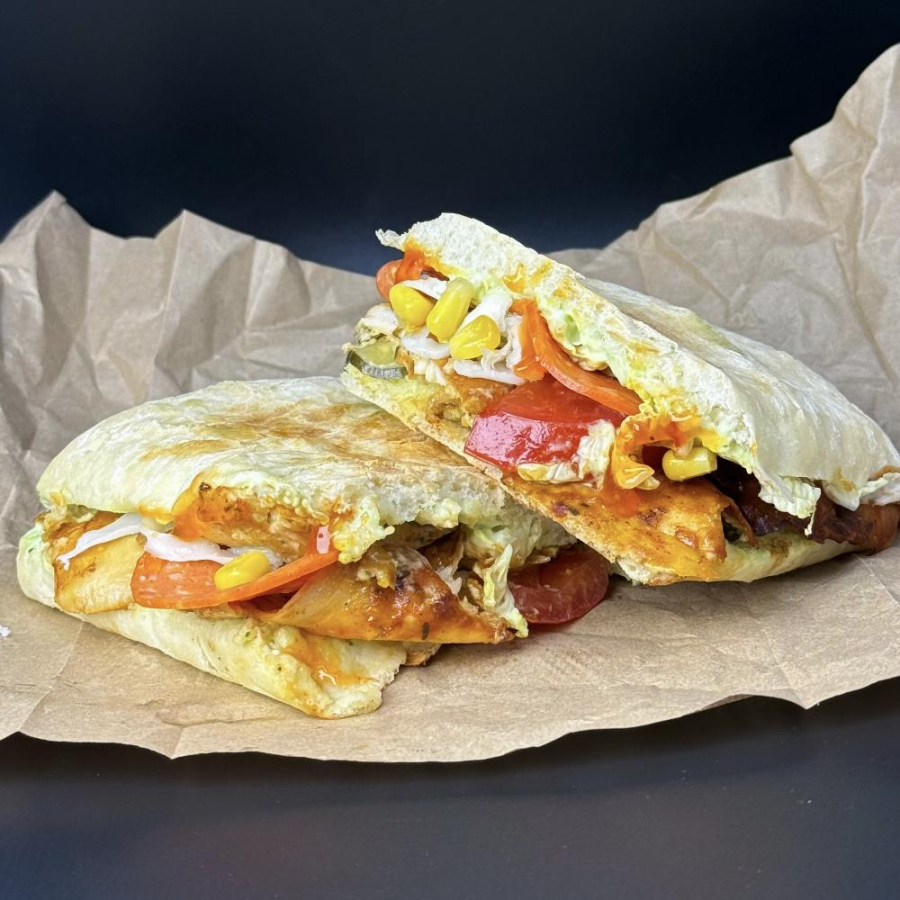 Панини, курица, чесночный соус, пекинка, помидор, сыр, кукуруза, остро-сладкий соус.