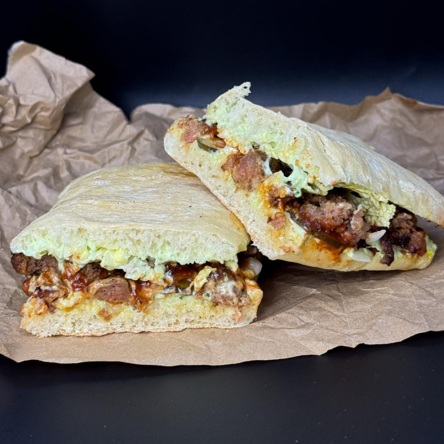 Панини, говядина, чесночный соус, пекинка, маринованный огурец, лук, аджика.