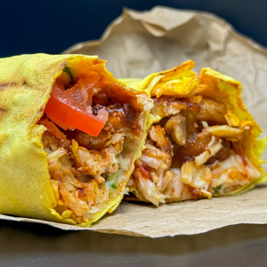 Заказать Лепешка, курица, чесночный соус, копченая грудинка, капуста, огурцы, помидоры, соус горчичный.