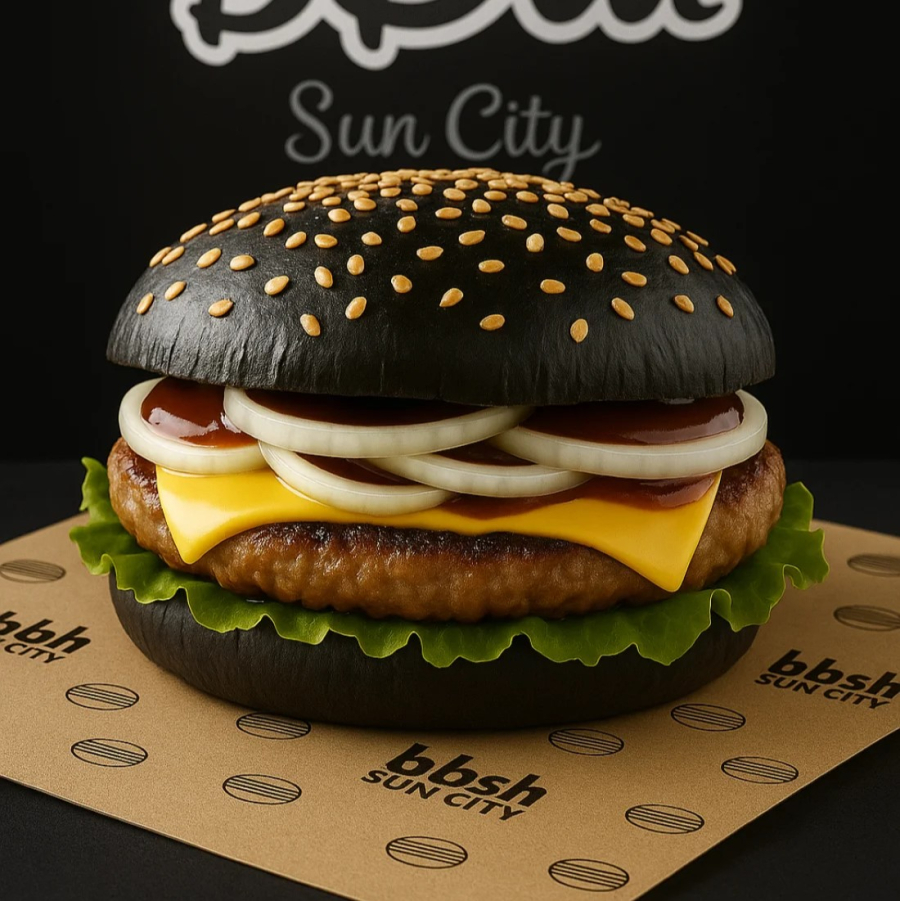 Заказать Булочка Бриошь черная, котлета свинина-говядина, кетчуп, соус 1000 островов, соус Барбекю, сыр Чеддер, помидор, огурец, маринованный лук, пекинская капуста.