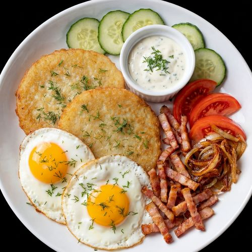 Драники, яичница-глазунья, хрустящий бекон, огурчик свежий, помидор, лук, жаренный во фритюре.