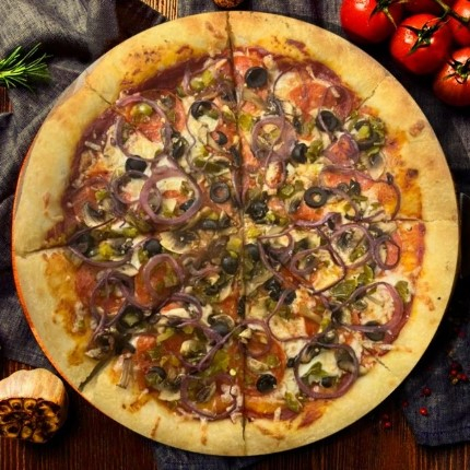Соус томатный, сыр моцарелла, колбаски пепперони, шампиньоны, маринованный лук, маслины, перец халапеньо, орегано.