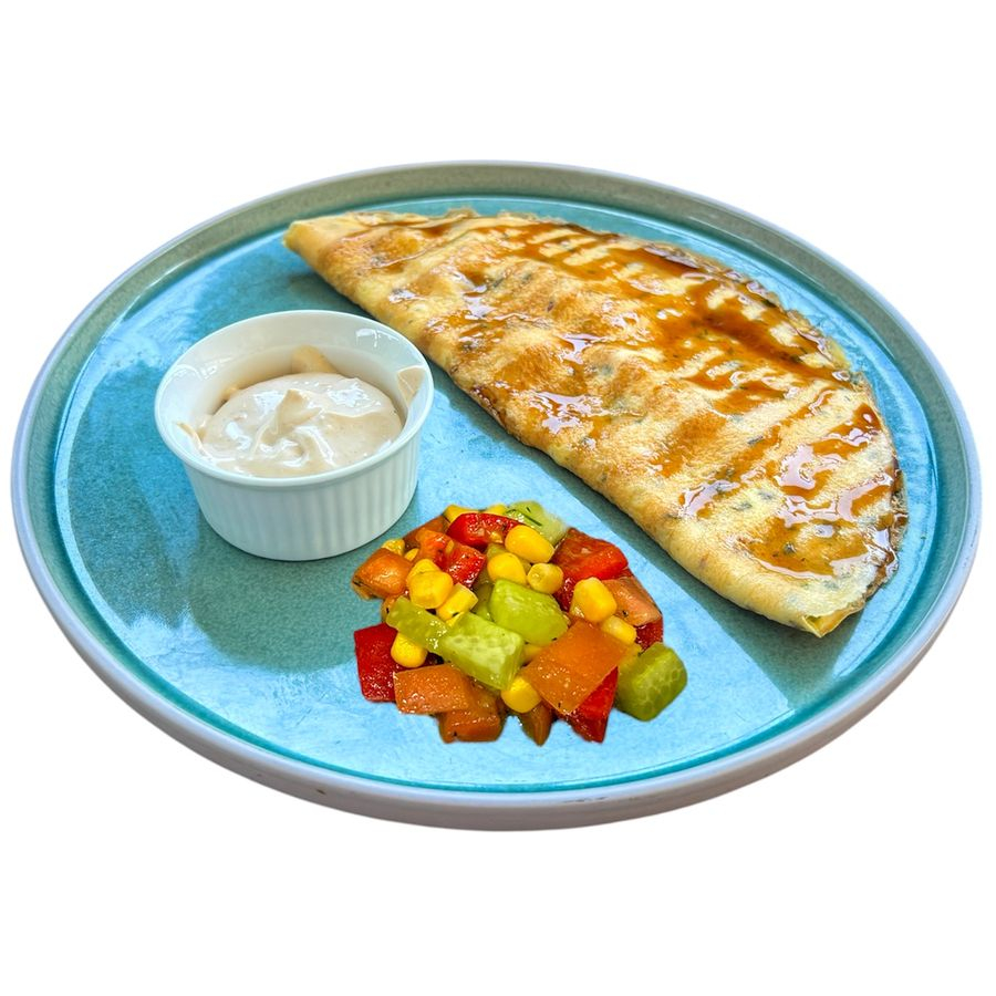 Заказать Яйца, курица, томат, сыр, зелень, соус терияки, салат, соус на выбор.
