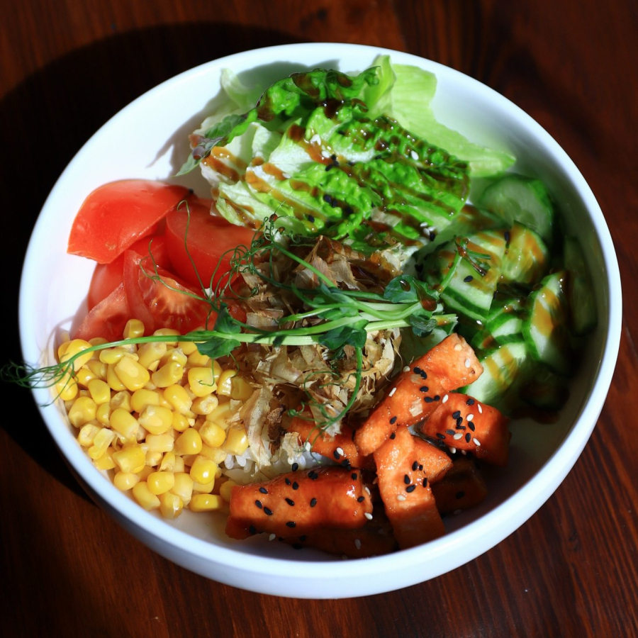 Рис, соевый соус, микс салат, огурец, лосось терияки, томат, соус терияки, кукуруза, стружка тунца, микрозелень.