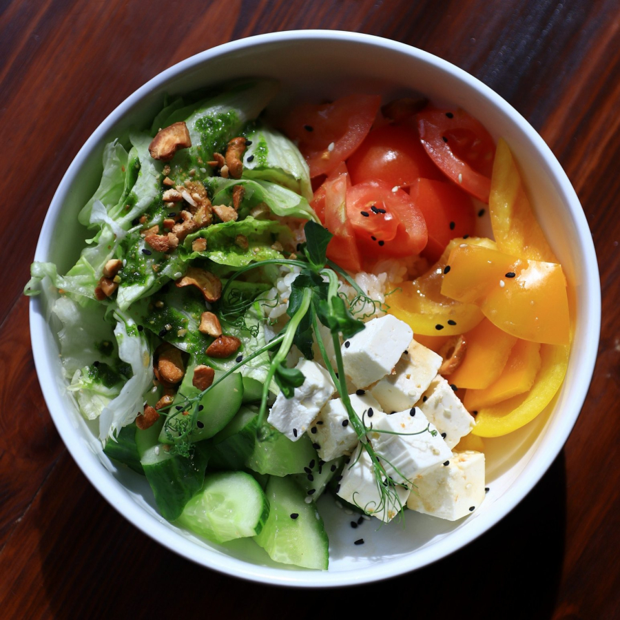 Рис, соевый соус, огурец, сыр брынза, салат микс, томат, перец свежий, орехи кешью, микрозелень, заправка горчичная.