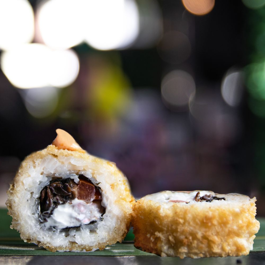 Заказать Рис, нори, филе лосося, зелёный лук, сливочный сыр, смесь темпура, сухари Панко.