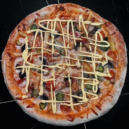 Томатная основа, сыр Моцарелла, говядина, курица, томаты черри, корнишоны, картофель фри, соус-бургер.