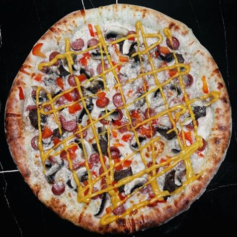 Чесночная основа, сыр Моцарелла, говядина, охотничьи колбаски, перец болгарский, шампиньоны, соус Карри.